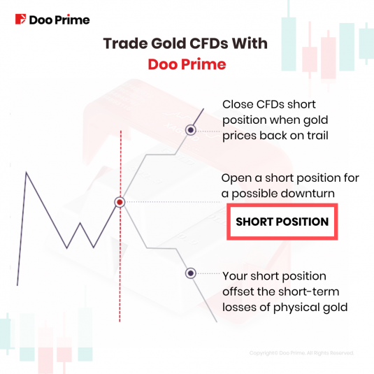 1. Say that you owned some physical gold bars and you plan on holding them over the long term. You believe that gold positions may be in for a downturn, therefore, you want to offset the potential short-term losses of your gold bar by purchasing gold CFDs short position.