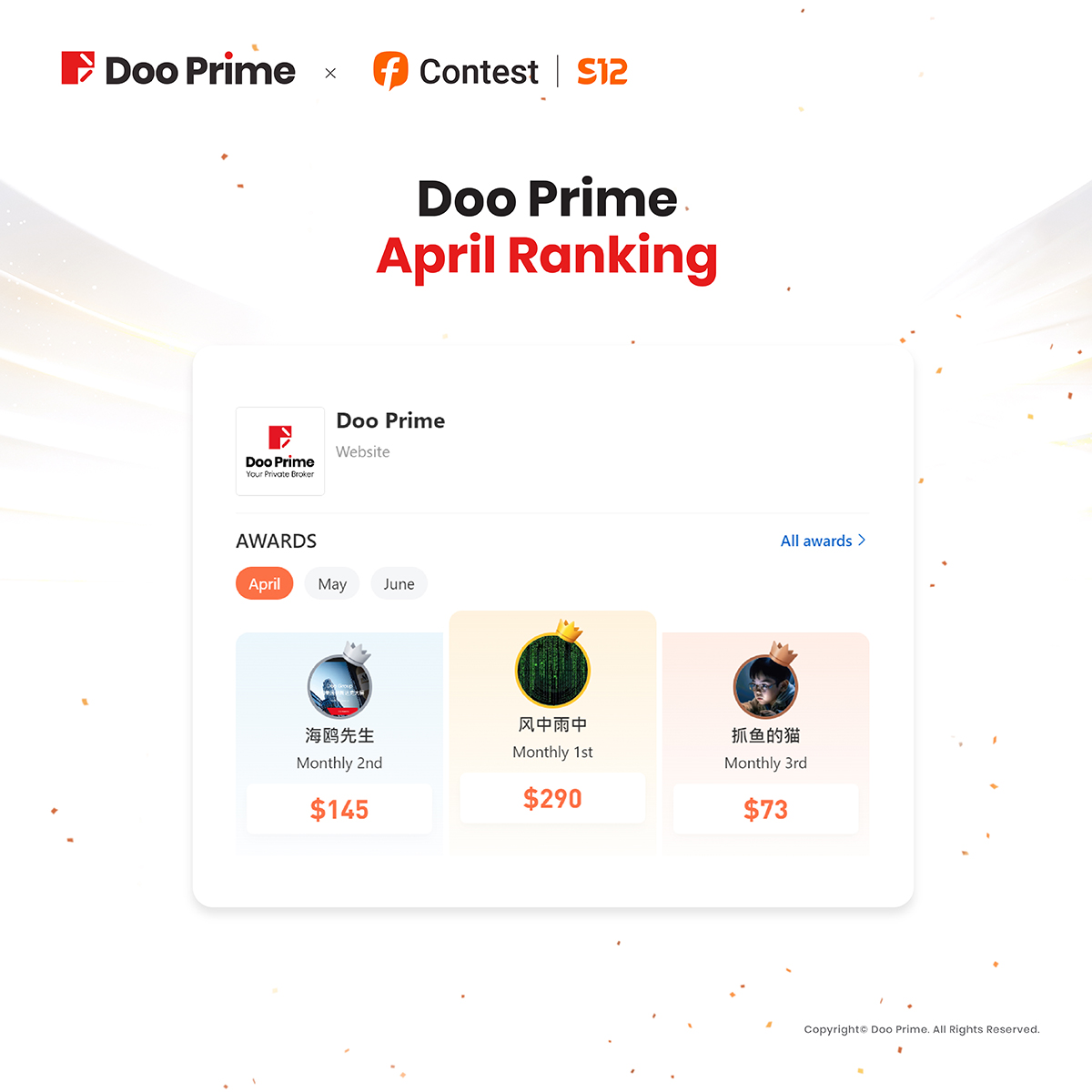 Looking back at the April results of the FOLLOWME S12 trading contest, Doo Prime traders have occupied the top five positions in two groups, showing remarkable strength and unstoppable momentum! Meanwhile, the results of the April monthly leaderboard are also out, with the top three Doo Prime traders sharing a prize pool of over USD500 for the month.