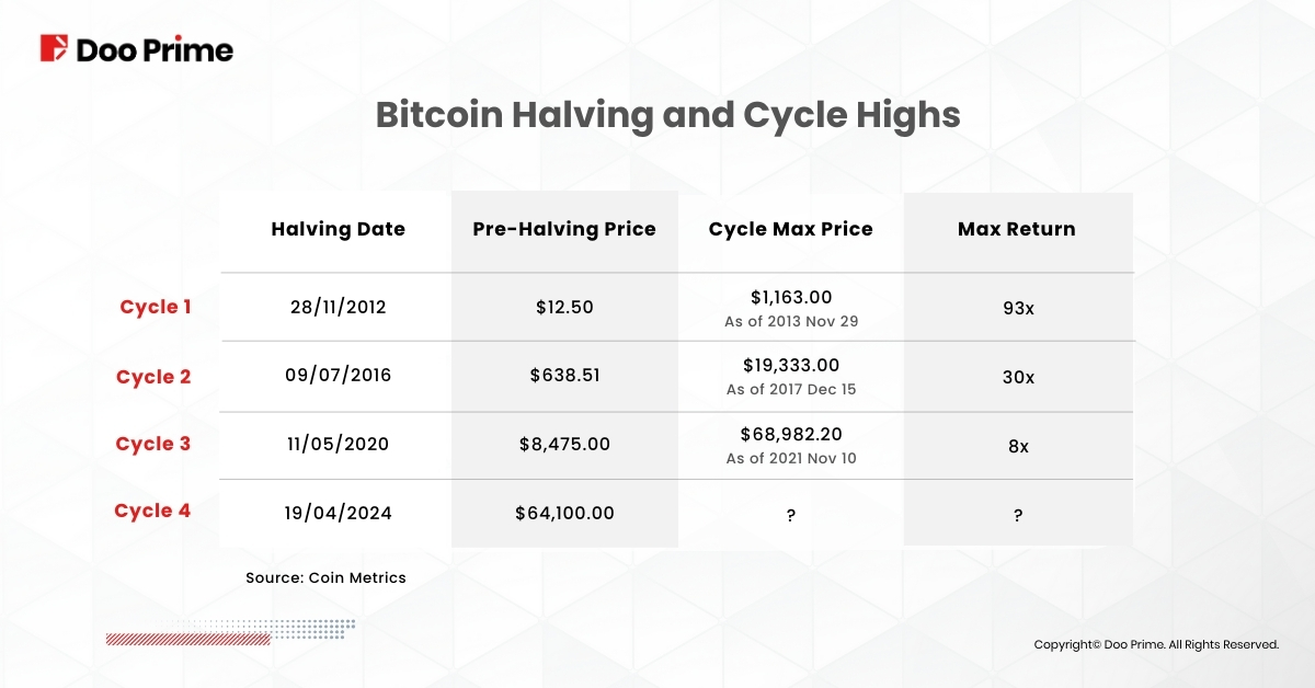 Bitcoin’s halving events have historically coincided with notable price movements, often leading to significant price appreciation in the months ahead. Looking back at previous halving events, historical data reveals substantial price surges. After the 2012, 2016, and 2020 halvings, Bitcoin’s price surged approximately 93x, 30x, and 8x respectively, from its halving day price to its cycle peak. While the halving itself may not immediately affect the price of Bitcoin, many investors anticipate significant gains in the months ahead based on historical data and market trends.