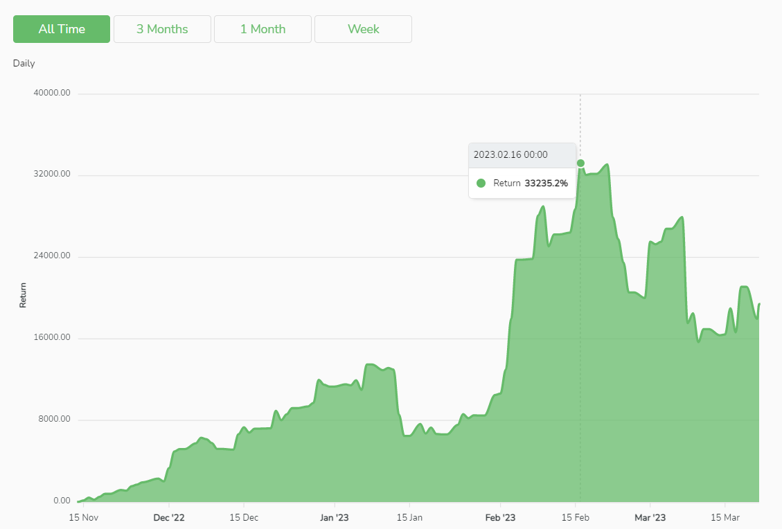 “Xiaoniu No. 0001” (小牛0001号), a trading signal provider was established on 4th October 2022. Since its establishment, its rate of return has achieved substantial growth, and the overall rate of return is among the best compared to other signal providers. In fact, on 16th February 2023, it reached a remarkable peak of 33,235.2%, representing a jump of more than 330 times.