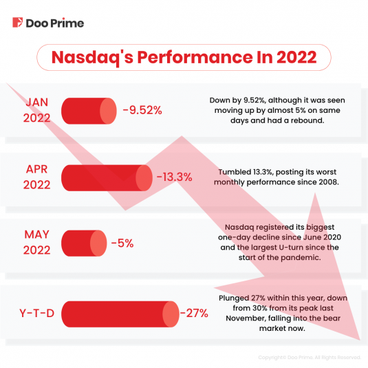 In April, the Nasdaq Composite tumbled 13.3%, posting its worst monthly performance since 2008. Then, on 6th May 2022, Nasdaq registered its biggest one-day decline since June 2020 and the largest U-turn since the start of the pandemic.