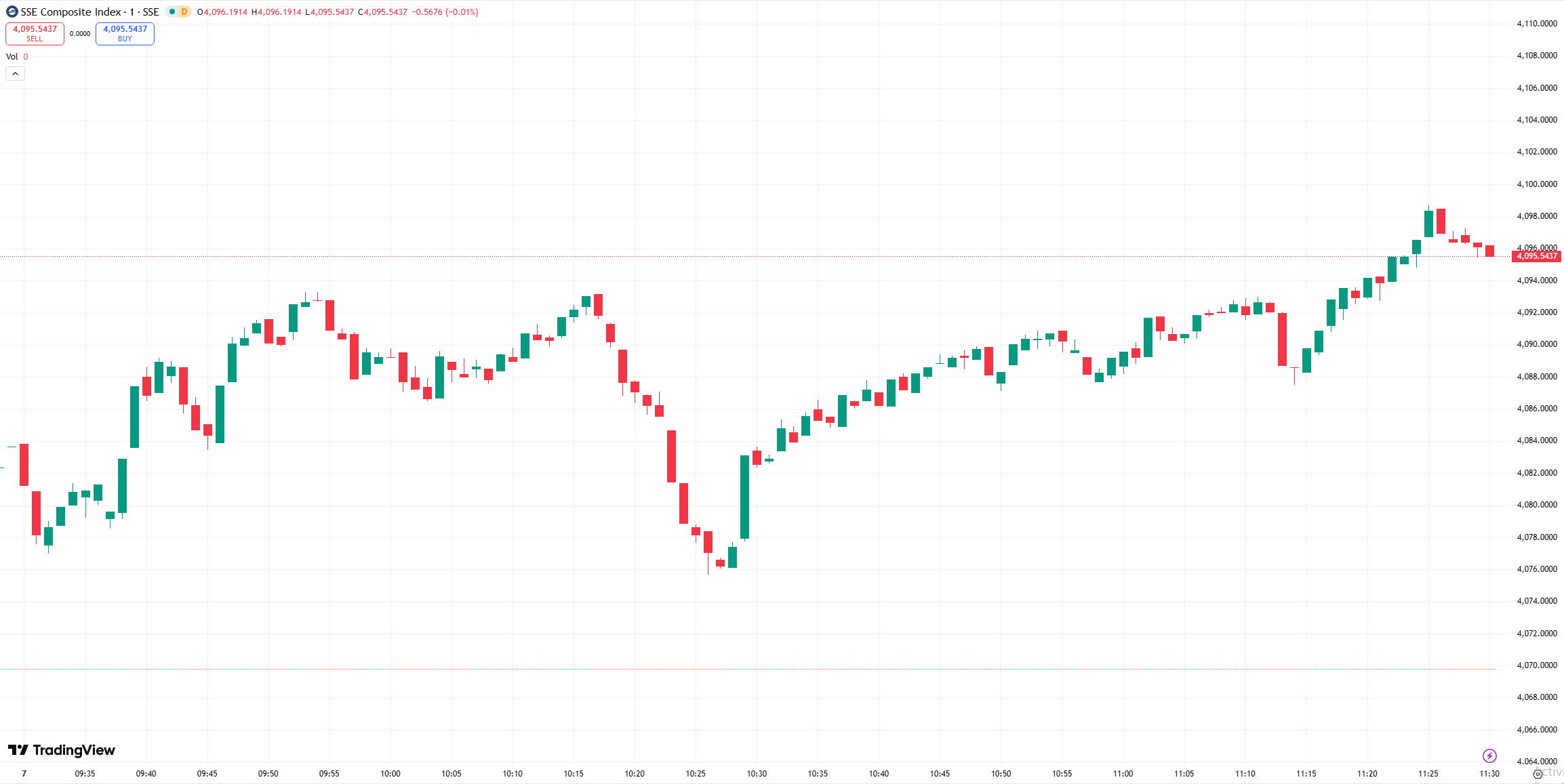 Mainland China equities opened higher across the board. By midday, the Shanghai Composite Index rose 0.29%, the Shenzhen Component gained 0.35%, the ChiNext advanced 0.41%, and the Beijing Stock Exchange 50 Index jumped 0.91%. Total turnover across Shanghai, Shenzhen, and Beijing reached RMB 1.85 trillion, up from the previous session, with more than 2,500 stocks advancing.