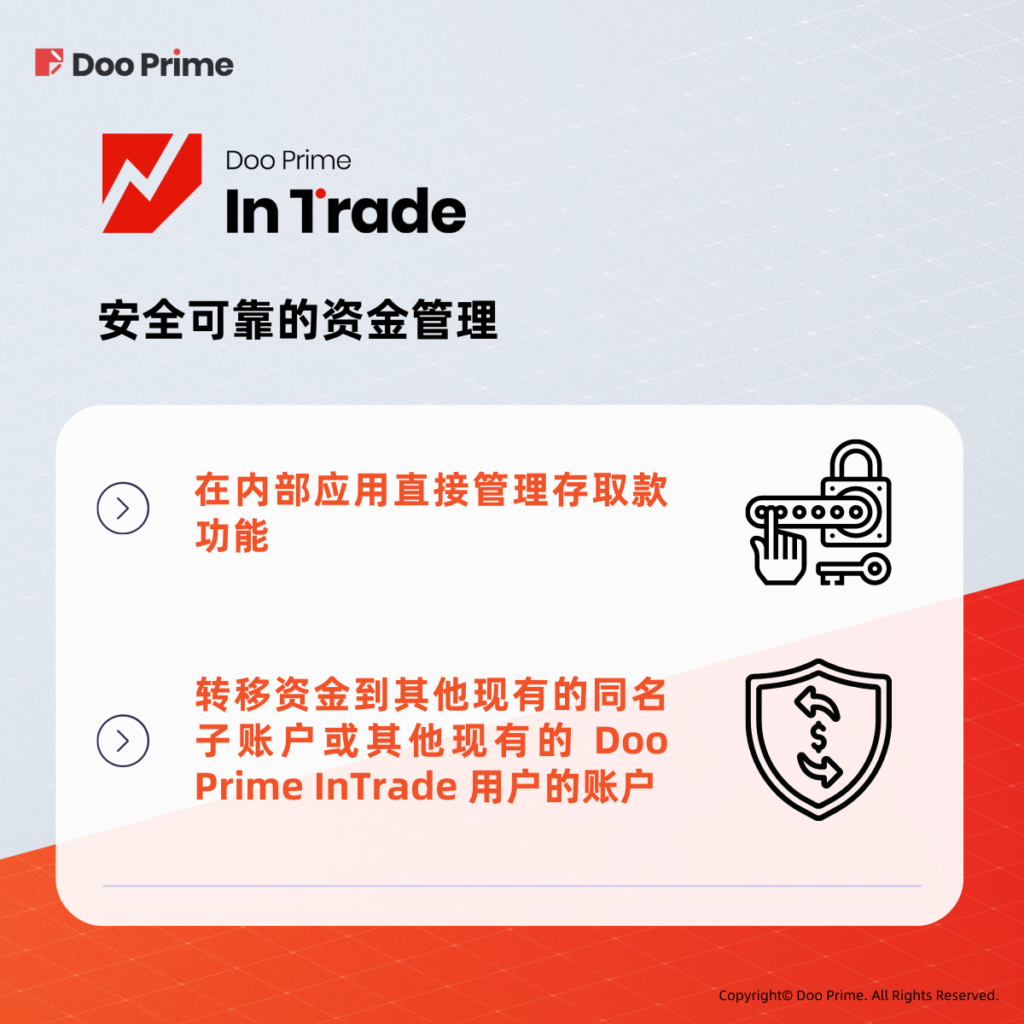 Doo Prime InTrade 让用户可以在内部应用直接管理存取款功能。此外,用户也可以将资金转移到其他现有的同名子账户,甚至还可以转账到其他现有的 Doo Prime InTrade 用户的账户。
