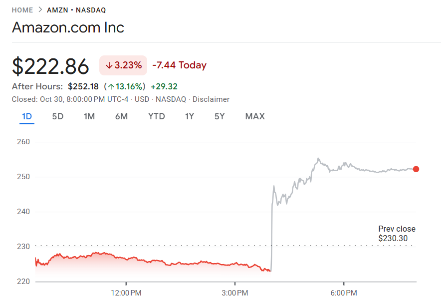 10 月 30 日至 31 日,亚马逊(AMZN)公布第三季度财报,营收同比增长 13.4% 至 1802 亿美元,超出市场预期的 1777 亿美元;每股收益(EPS)1.95 美元,同样优于市场预期的 1.56 美元,显示公司整体业务增长动能强劲。