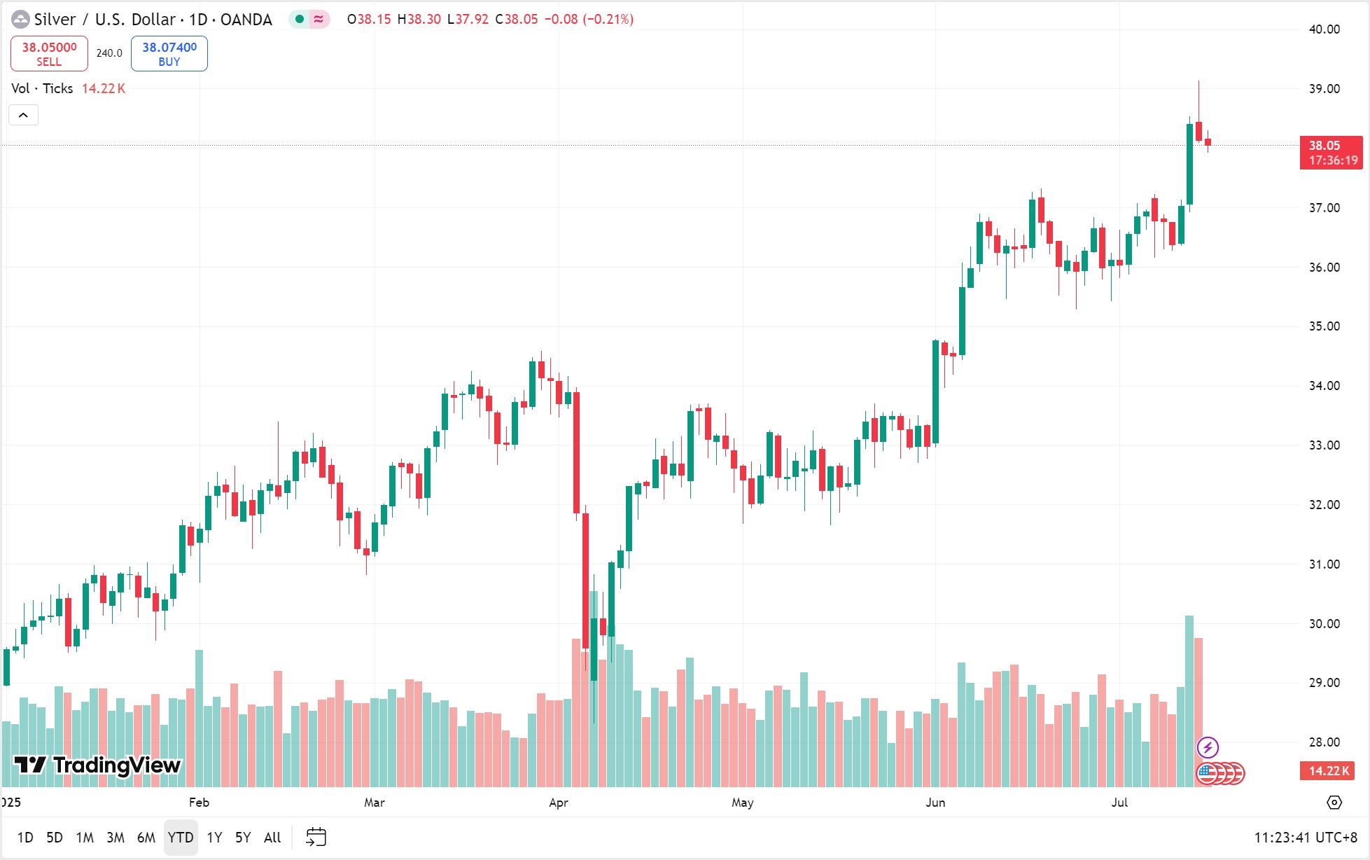 周一,现货白银延续涨势,盘中一度上涨近 2%,突破 39 美元/盎司,刷新近十四年高位。截至收盘,现货白银年内累计上涨逾 32%,跑赢黄金约 28% 的涨幅。