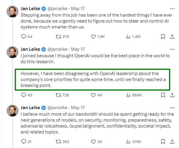 Jan Leike 随即在社交媒体 X 上公开透露了他离职的部分原因,暗示他与 OpenAI 高层在公司的核心优先事项上存在长期分歧,最终双方的分歧已经严重到无法调和的地步。此外,团队在推动其研究项目和争取计算资源时遇到了重大阻碍,缺乏资源会严重影响研究的进度和质量。