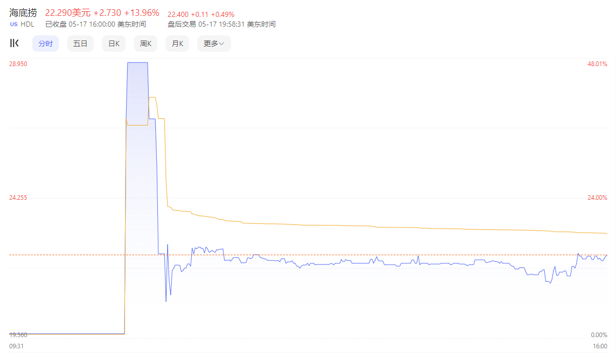 5 月 17 日,海底捞旗下子公司特海国际以 HDL 为股票代码在纳斯达克挂牌交易,开盘价报 27 美元,较 IPO 发行价 19.56 美元高 38%。此后,HDL 股价曾涨至 30 美元,日内涨幅扩大到 53.4%,最终收涨约 14%,收报 22.29 美元。
