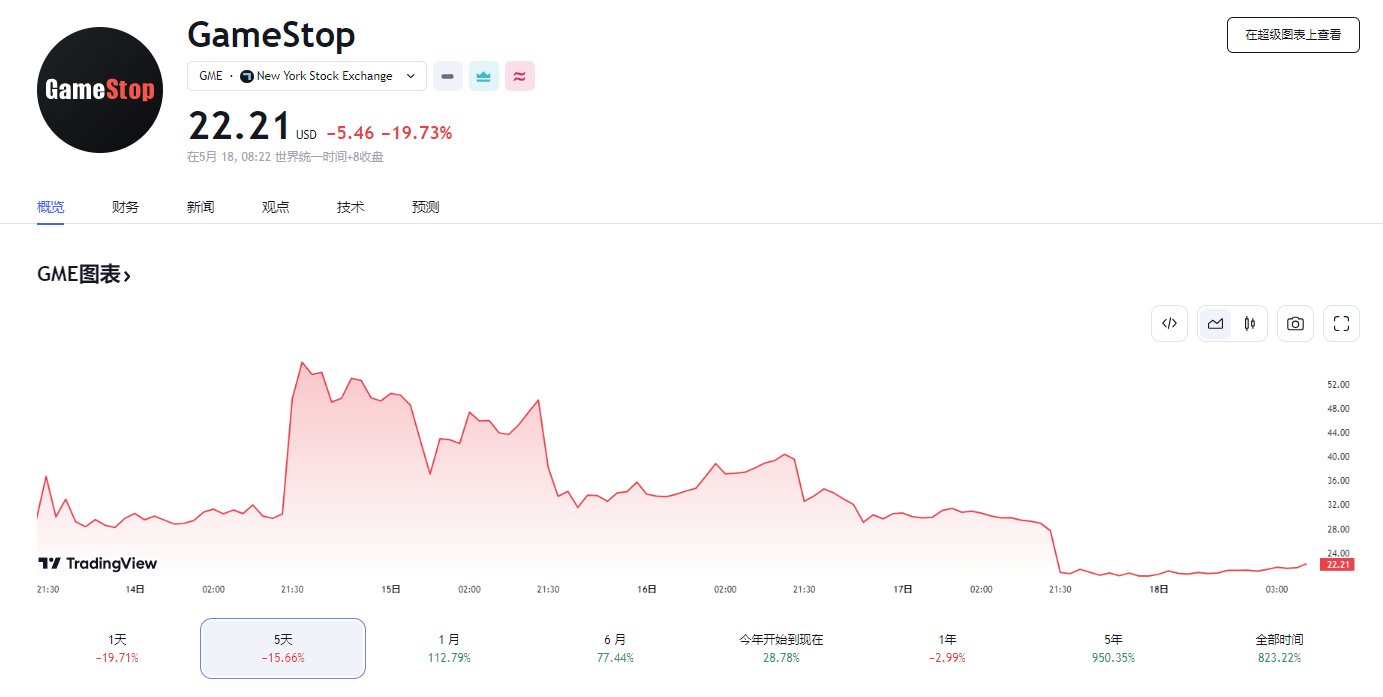17 日,游戏驿站发布一季度财报,并宣布出售至多 4500 万股 A 类股票,周五盘前大跌近 20%。