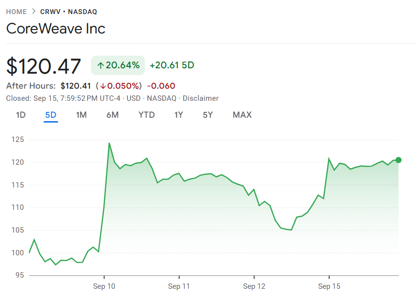 受此提振,CoreWeave 股价盘中一度大涨近 8%,尾盘涨幅收窄至 5.09%,报 117.66 美元。这笔交易不仅进一步巩固其作为英伟达核心云端合作伙伴的地位,也为公司提供一层“保底”保障,以应对 AI 运算需求可能放缓的风险。