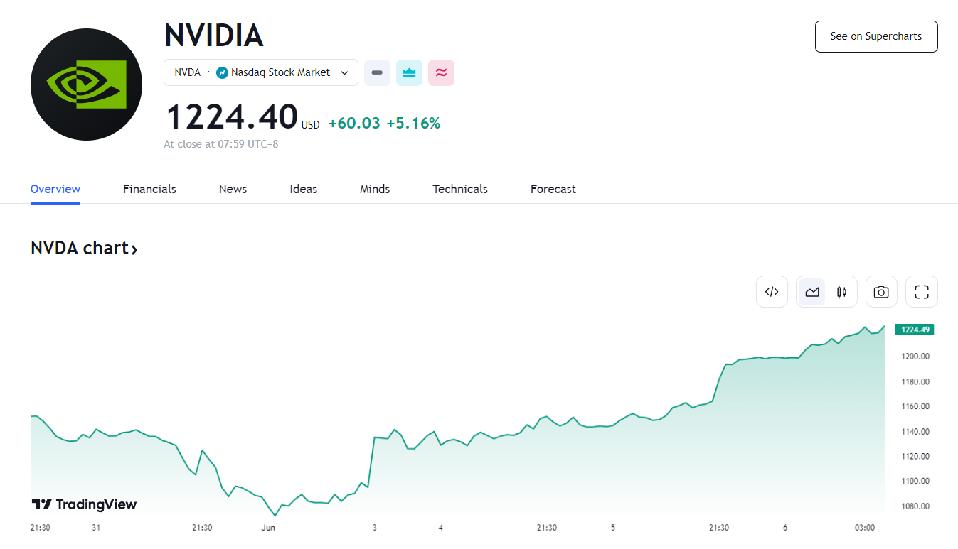 英伟达股价再创新高,报收 1224.40 美元,涨幅达 5.16%,市值约为 3.012 万亿美元,超越苹果的 3.0035 万亿美元,成为美股市值第二大的科技公司。