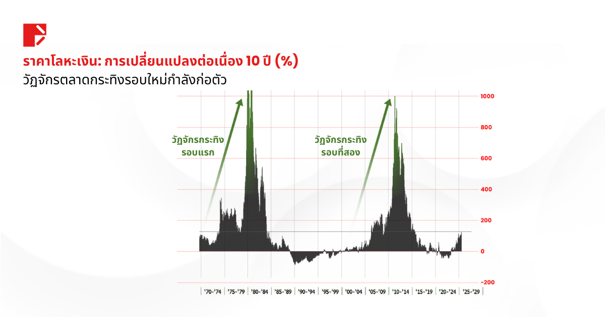 หากย้อนไปปี 2554 ราคาซิลเวอร์พุ่งจาก $35 ไปเกือบ $50 ภายในเวลาเพียง 6 สัปดาห์ หรือคิดเป็นการขยับขึ้นกว่า 40% ในไม่ถึงสองเดือน เป็นรอบที่พุ่งแรงและรวดเร็วจากแรงกดดันด้านเงินเฟ้อ ค่าเงินดอลลาร์ที่อ่อนตัว และความต้องการในสินทรัพย์ปลอดภัย