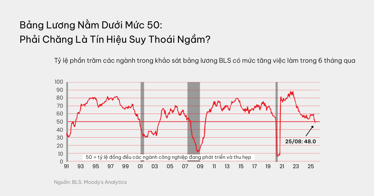 Dữ liệu bảng lương mới nhất từ BLS (Cục Thống kê Lao động Mỹ) cho thấy chỉ có 48% ngành nghề gia tăng nhân sự trong 6 tháng vừa qua – mức thấp nhất kể từ thời kỳ đại dịch. Điều này cần được quan tâm bởi lẽ, trong lịch sử, khi mức tăng trưởng việc làm xuống dưới 50%, nền kinh tế thường đã rơi vào suy thoái hoặc sắp bước vào giai đoạn đó.