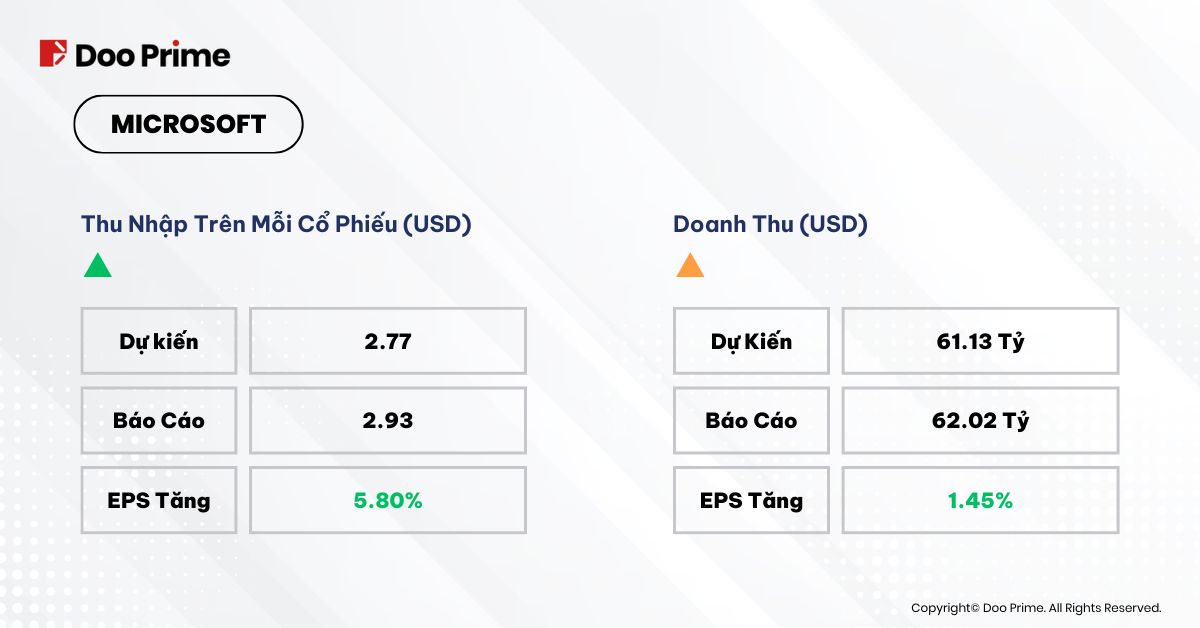 Mặc dù doanh thu và EPS đều tăng vượt trội, Microsoft vẫn bị nhận những phản ứng yếu ớt của thị trường. MSFT đã giảm 1%, khiến vốn hóa thị trường của Microsoft giảm xuống dưới mức 3 nghìn tỷ USD. Tóm lại, Microsoft vẫn tăng trưởng tốt trong lĩnh vực điện toán đám mây và tập trung phát triển mảng AI, mặc cho những lo ngại về doanh thu hồi Q3.