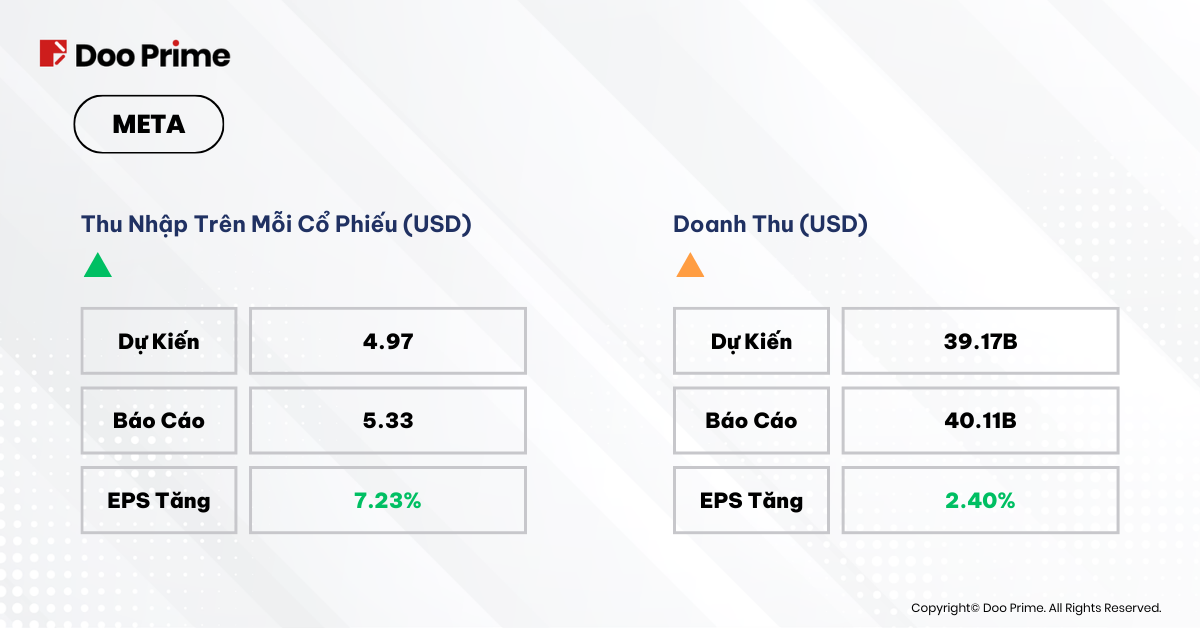 Meta đã vượt qua mọi kỳ vọng trong Q4 năm 2023, giúp cổ phiếu của họ tăng lên đến 20%. Doanh thu và EPS đồng thời tăng vượt ngưỡng dự đoán của các nhà phân tích, đạt mức 25% tăng trưởng doanh thu so với cùng kỳ năm trước. Meta cũng đã công bố mức cổ tức hàng quý lần đầu tiên và khoản mua lại cổ phiếu trị giá 50 tỷ USD. Điều này đã khiến nhiều nhà đầu tư trở nên rất phấn khích. Mặt khác, các khoản đầu tư vào Metaverse vẫn được duy trì, nhưng mối lo về khả năng sinh lời của dự án này vẫn là dấu chấm hỏi cần được chứng minh.