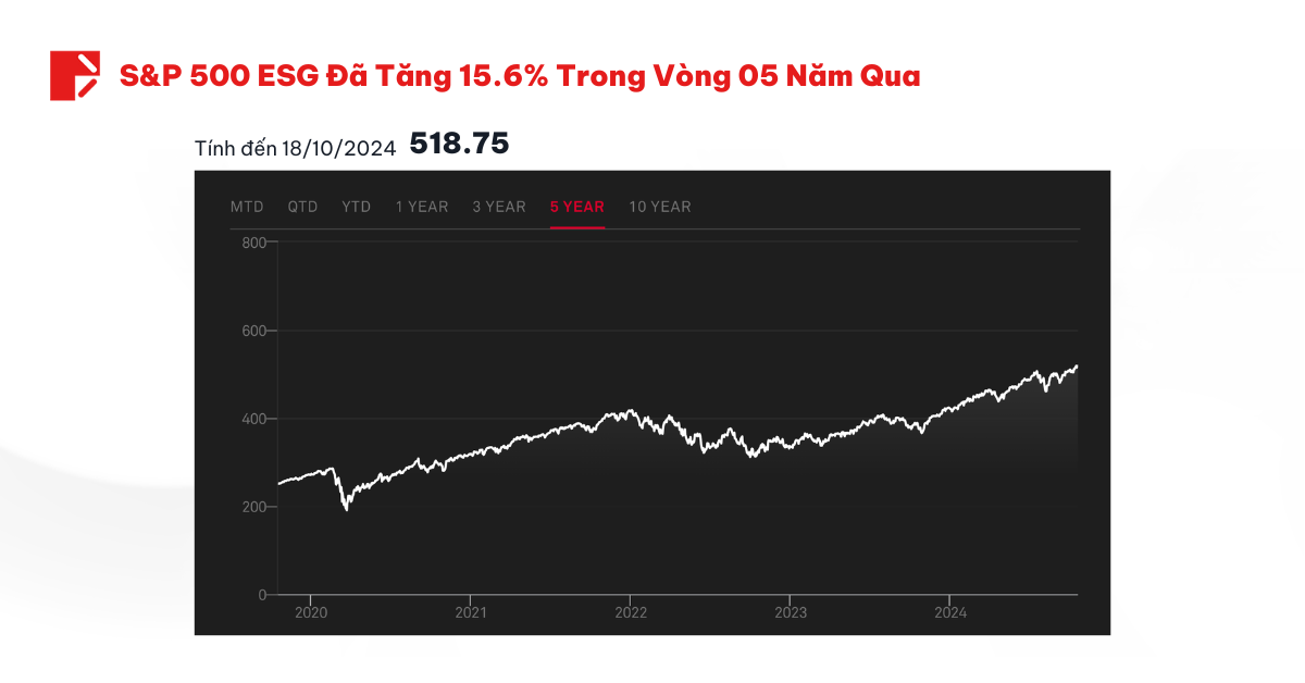 Chỉ số S&P 500 ESG Index, theo dõi hiệu suất của các công ty trong S&P 500 có thực hiện tốt về ESG đã tăng 15,6% trong 5 năm qua, hiện đang ở mức cao nhất là 518,75 vào ngày 18 tháng 10, tức bốn ngày sau khi giải Nobel kinh tế 2024 được công bố.